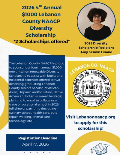 For 2026, we are especially proud to sponsor TWO $1,000 one time/non renewable Diversity Scholarships to assist with books and incidental expenses offered to two deserving graduating Lebanon County seniors of color (of African, Asian, Hispanic and/or Latino, Native American or mixed heritage) planning to enroll in college or a trade or vocational school in 2026-2027, full-time or part-time (including culinary school, health care, auto repair, welding, animal care, technology, etc.).